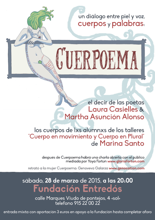 Cuerpoema es un experimento de danza y poesía dirigido por la bailarina brasileña Marina Santo y que contará con la presencia y los poemas de dos maravillosas poetas, Laura Casielles y Martha Asunción Alonso.Cuerpoema, todo un acontecimiento músico-poético que se celebrará en Fundación Entredós, un diálogo entre piel y voz, entre cuerpos y palabras, delSigue leyendo «Cuerpoema»
